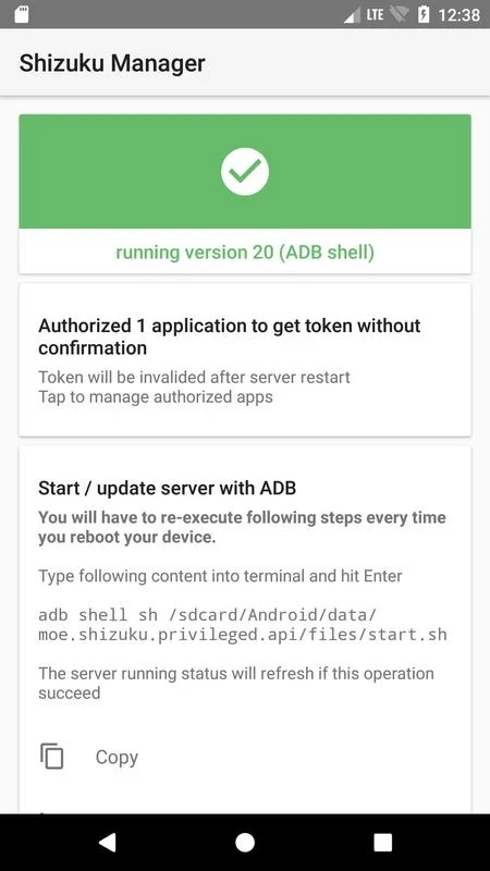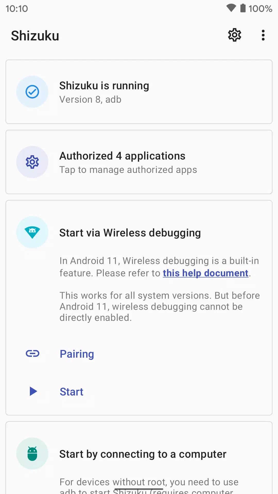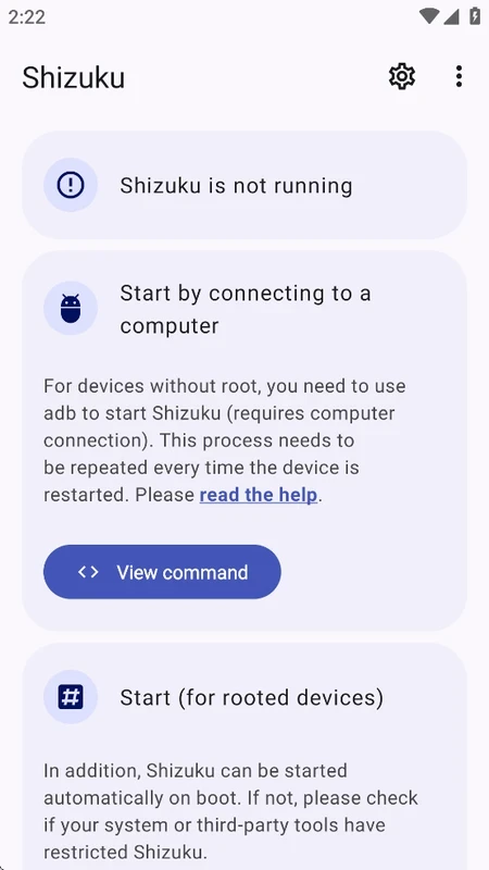 แอปนี้รองรับสองวิธีในการเริ่มต้นเซิร์ฟเวอร์ Shizuku: ADB สำหรับการตั้งค่าที่ไม่ต้องรูท หรือด้วยสิทธิ์รูทหากมี การรีบูตอุปกรณ์ของคุณจะช่วยให้เริ่มต้นในโหมด ADB ได้อย่างรวดเร็ว ในขณะที่การเริ่มต้นใหม่ทำได้ง่ายกว่าในโหมดรูท และคุณสามารถเลือกวิธีการตามความต้องการของคุณได้